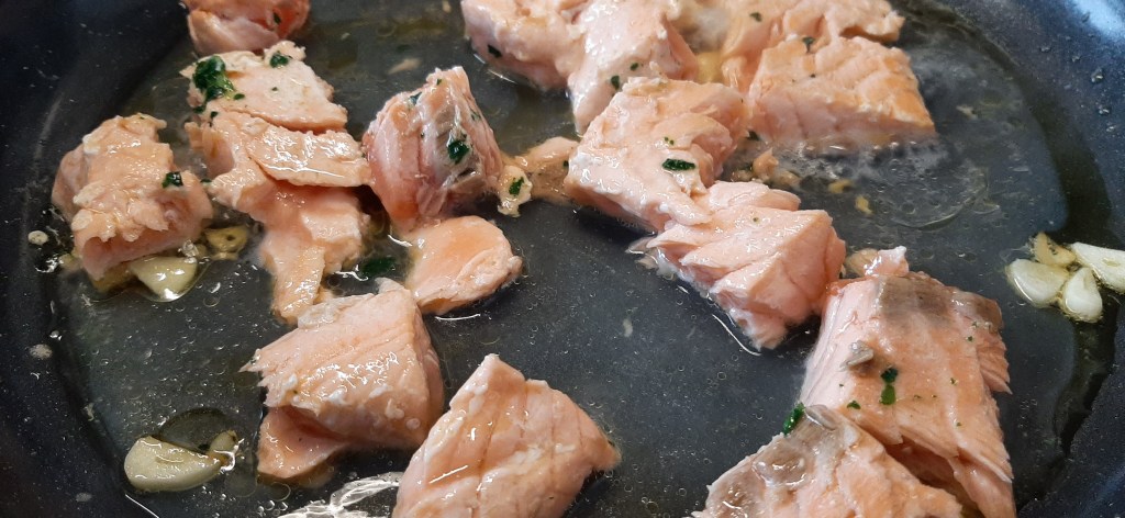 - Danach den Lachs in die Pfanne geben und von beiden Seiten gut anbraten, bis er zerfällt.